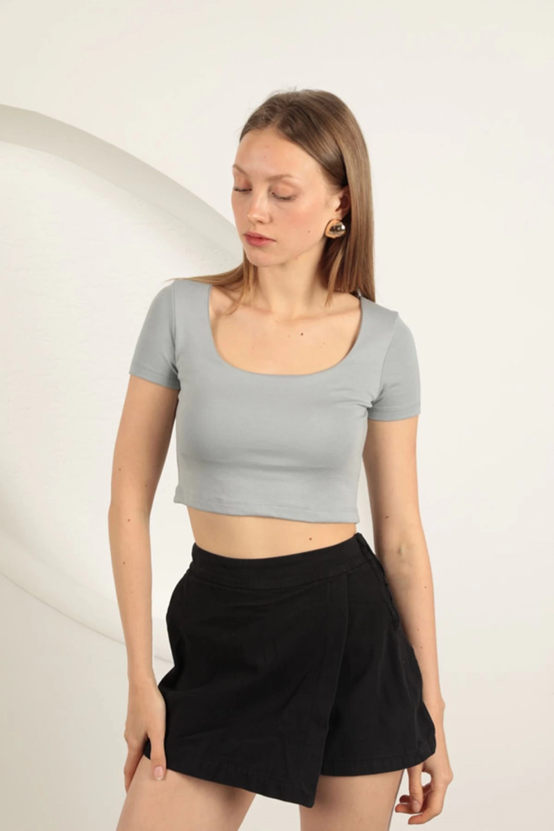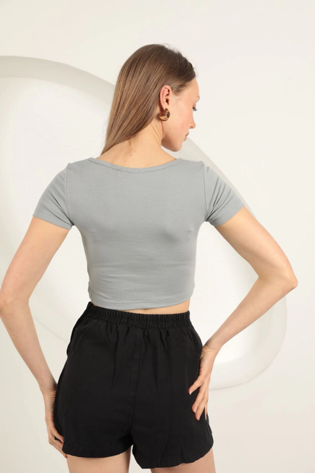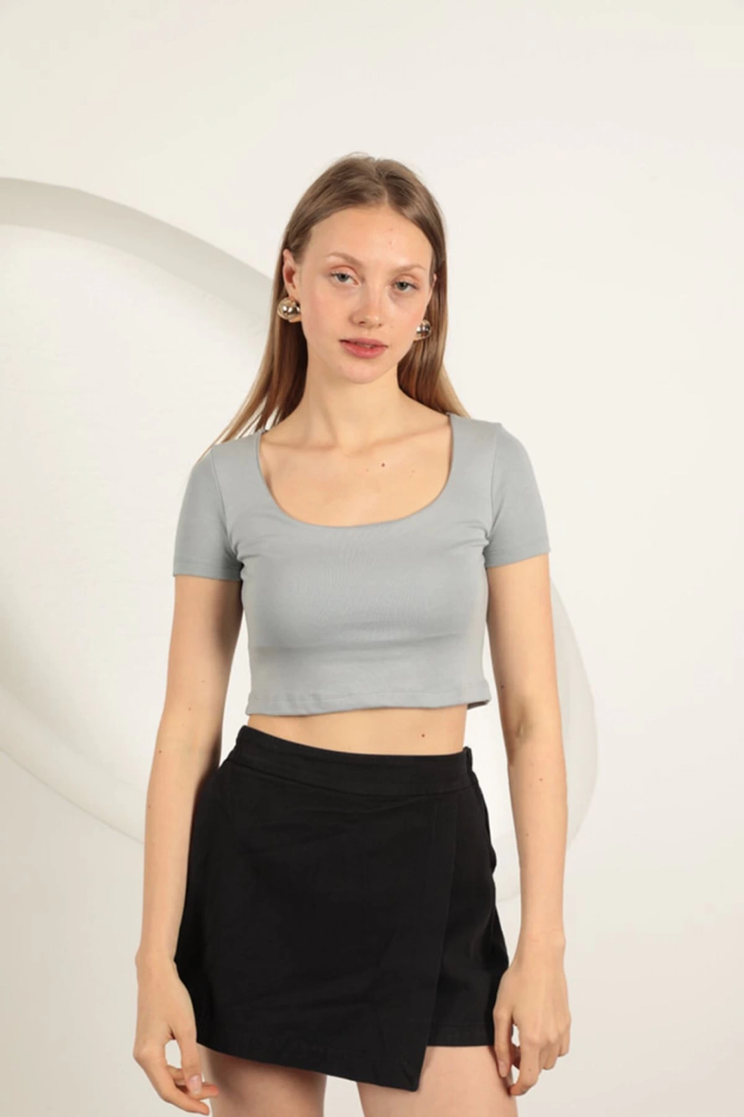 Çilek Viskon Kumaş U Yaka Bluz-Gri