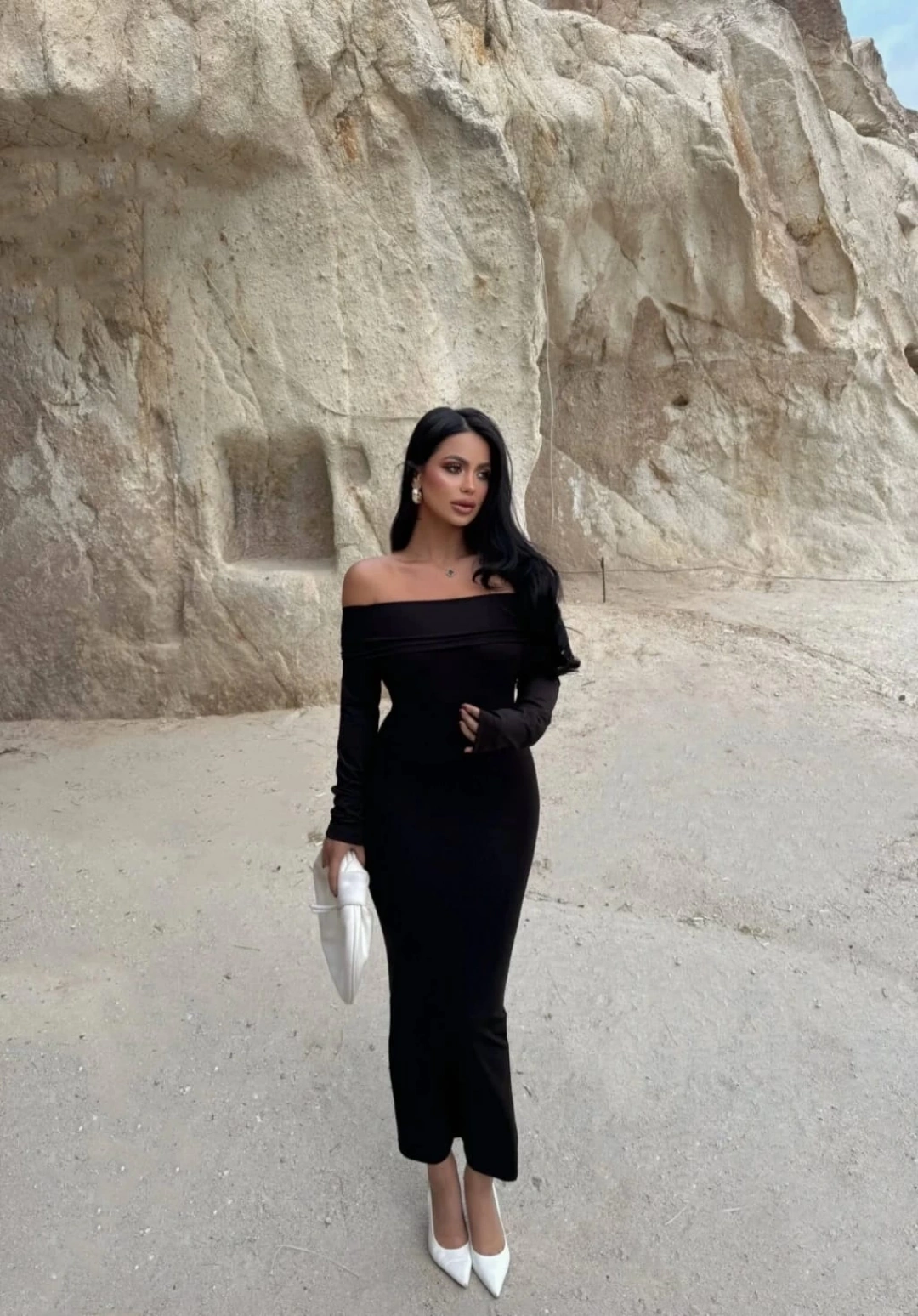 Madonna yaka esnek kumaş elbise siyah, gardırobunuzun vazgeçilmezi olmaya aday bir parça! Hem şık hem de rahat yapısı ile öne çıkan bu elbise, günün her saati şıklığınızı tamamlamak için ideal bir tercih.