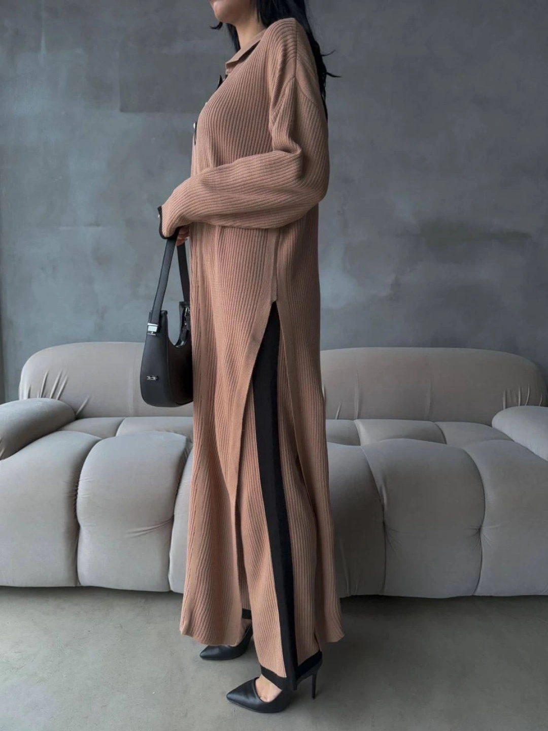Vizon rengi ve modern tasarımı ile dikkat çeken elf Pantolon Yırtmaçlı Elbise İkili Triko Takım, şıklığı ve rahatlığı bir arada sunuyor.