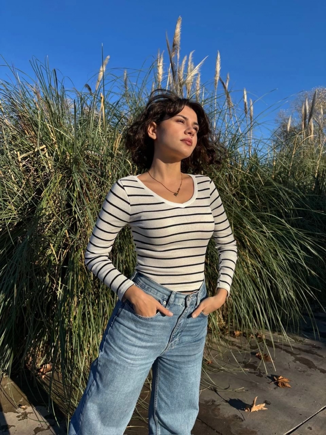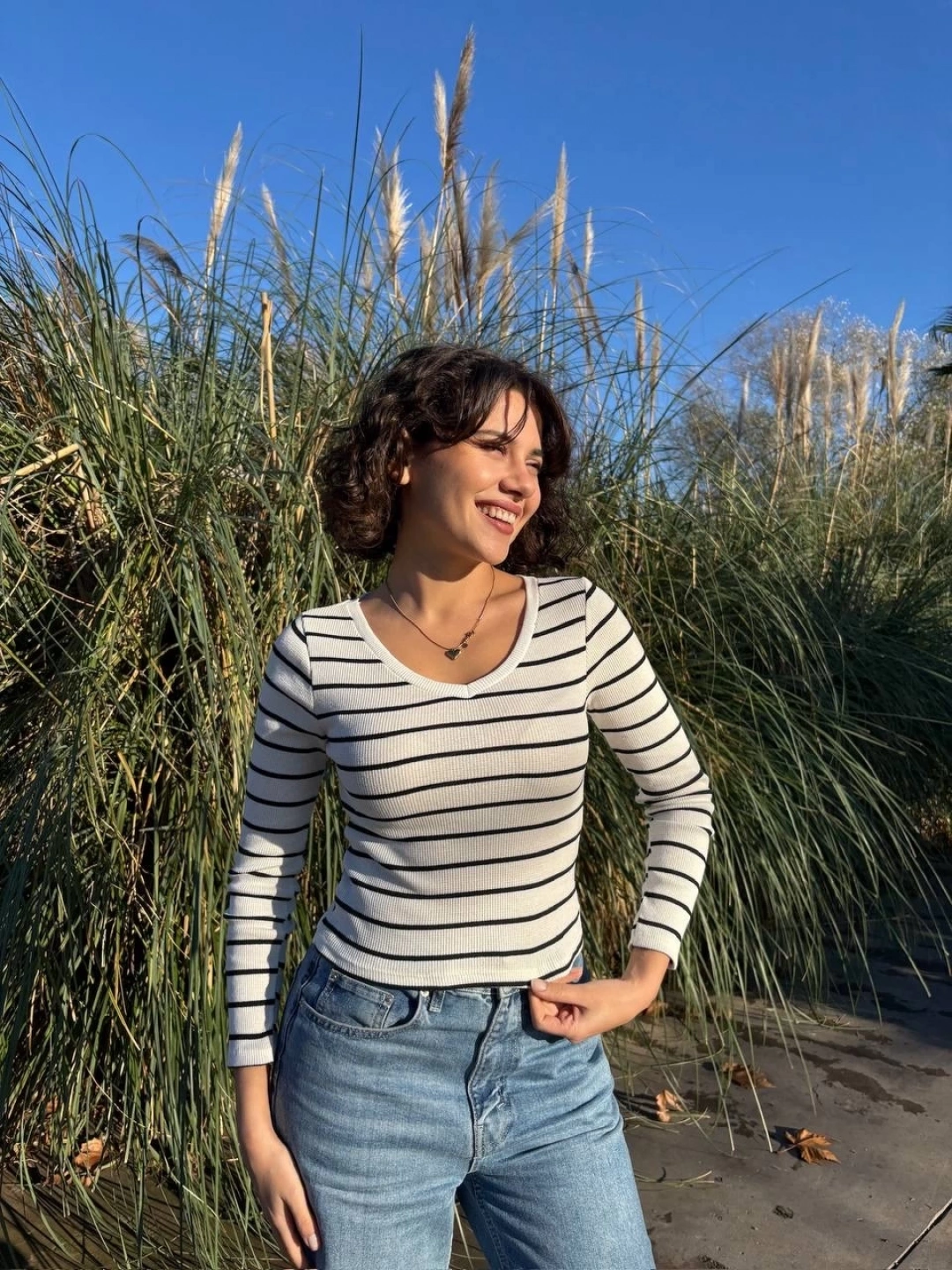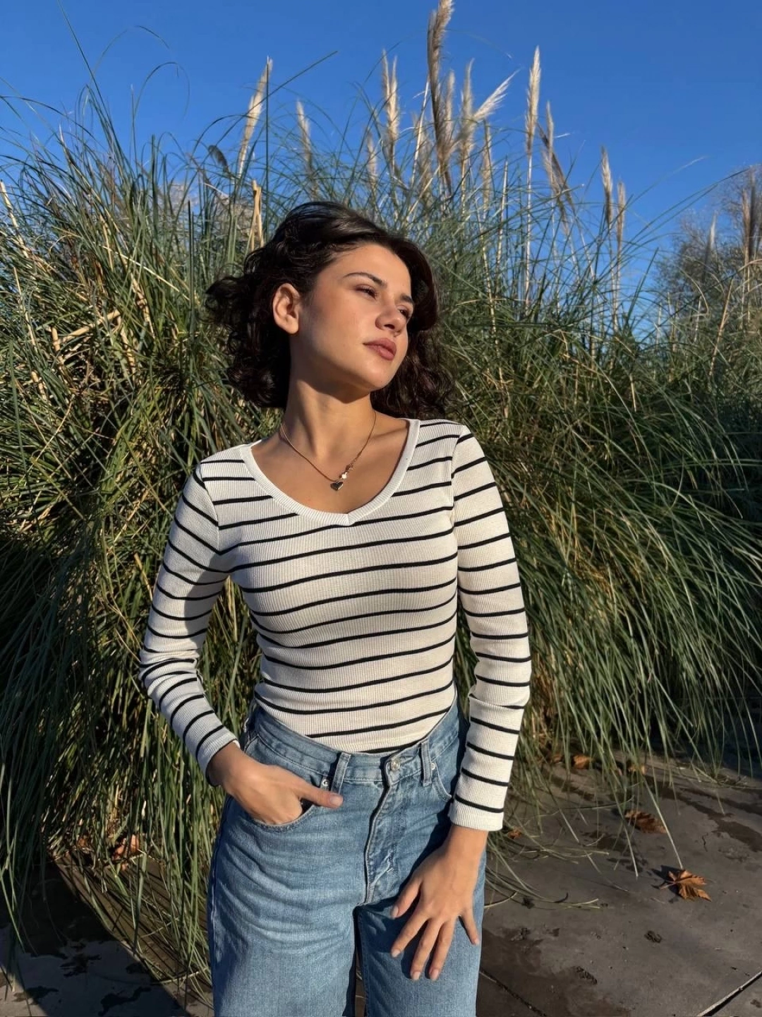 Şıklığı ve rahatlığı bir arada sunan beyaz V yaka çizgili bluz A3699, gardırobunuzun vazgeçilmezi olmaya aday!
