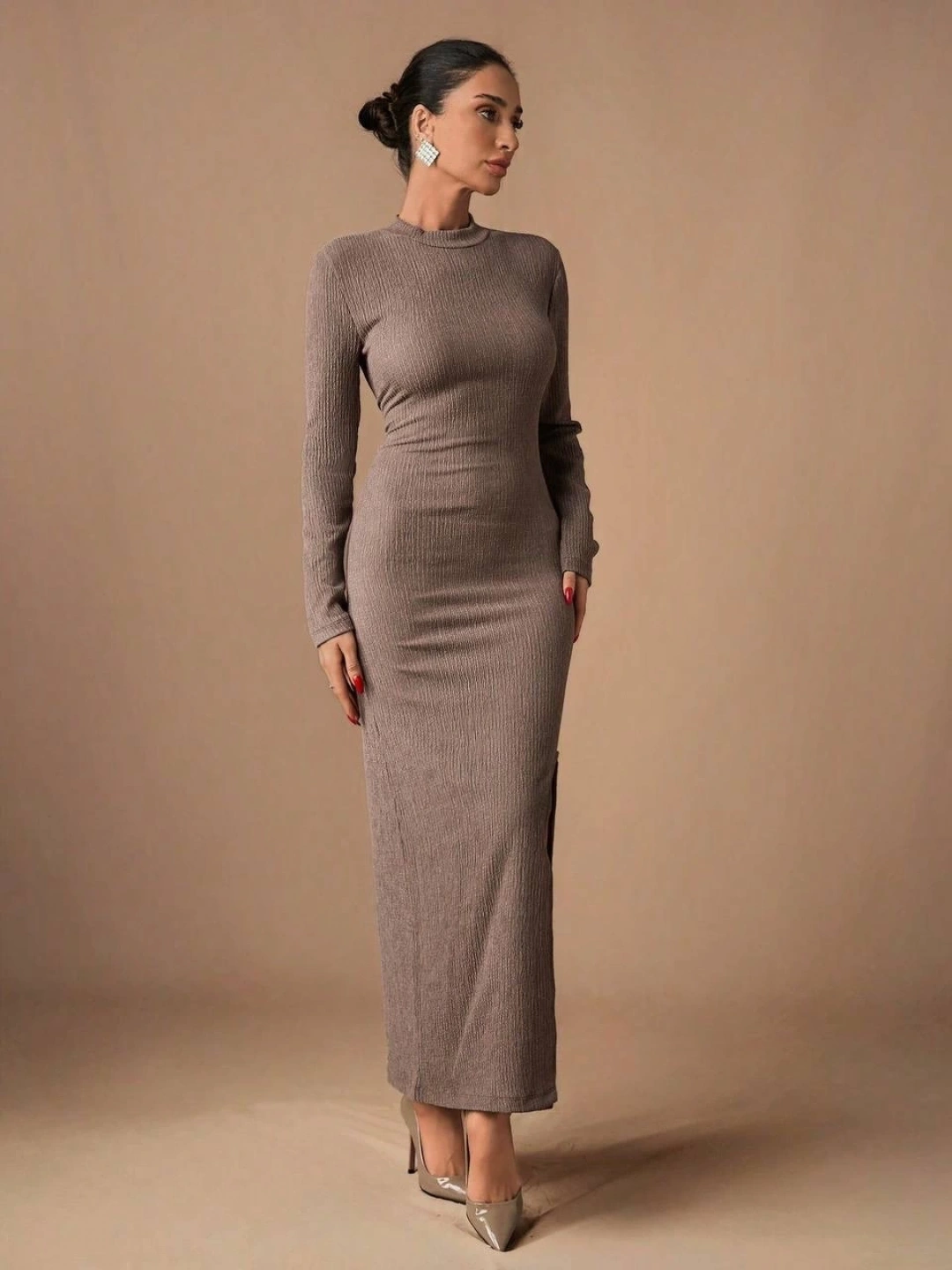 Markamızın son koleksiyonundaki Yırtmaçlı Kalın Bürümcük Uzun Elbise Vizon, şıklığı ve rahatlığı bir arada sunuyor.